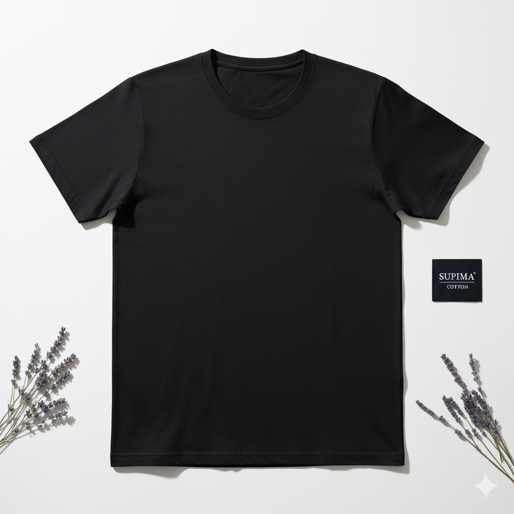 Crafted from premium Supima cotton sourced from top mills, this black round neck t-shirt features long fibers that ensure a smooth, lustrous finish. Its superior quality fabric provides exceptional softness and durability, making it a refined choice for everyday wear with lasting comfort and a polished look.